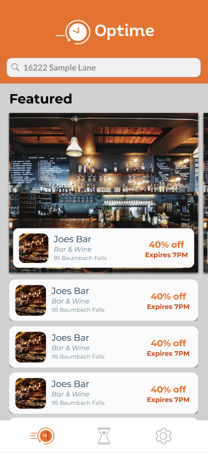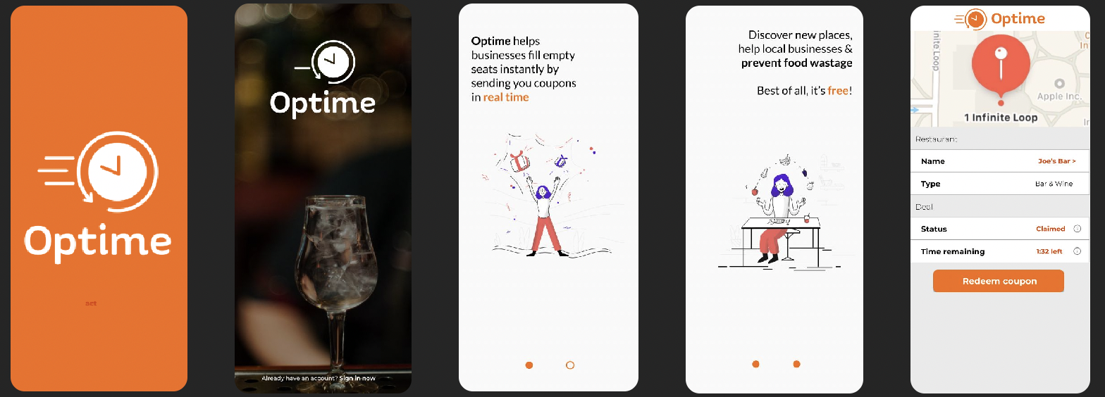 Optime was a startup I came across in 2020, which was created in an effort to fill empty seats in restaurants at dead times during the day. I was able to create a few onboarding idea screens and some general coupon incentives and scrolling screens as well.